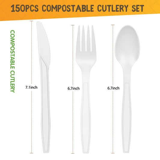 Compostable Utensils Set 150pcs Disposable Forks Knives Spoons Biodegradable Cutlery