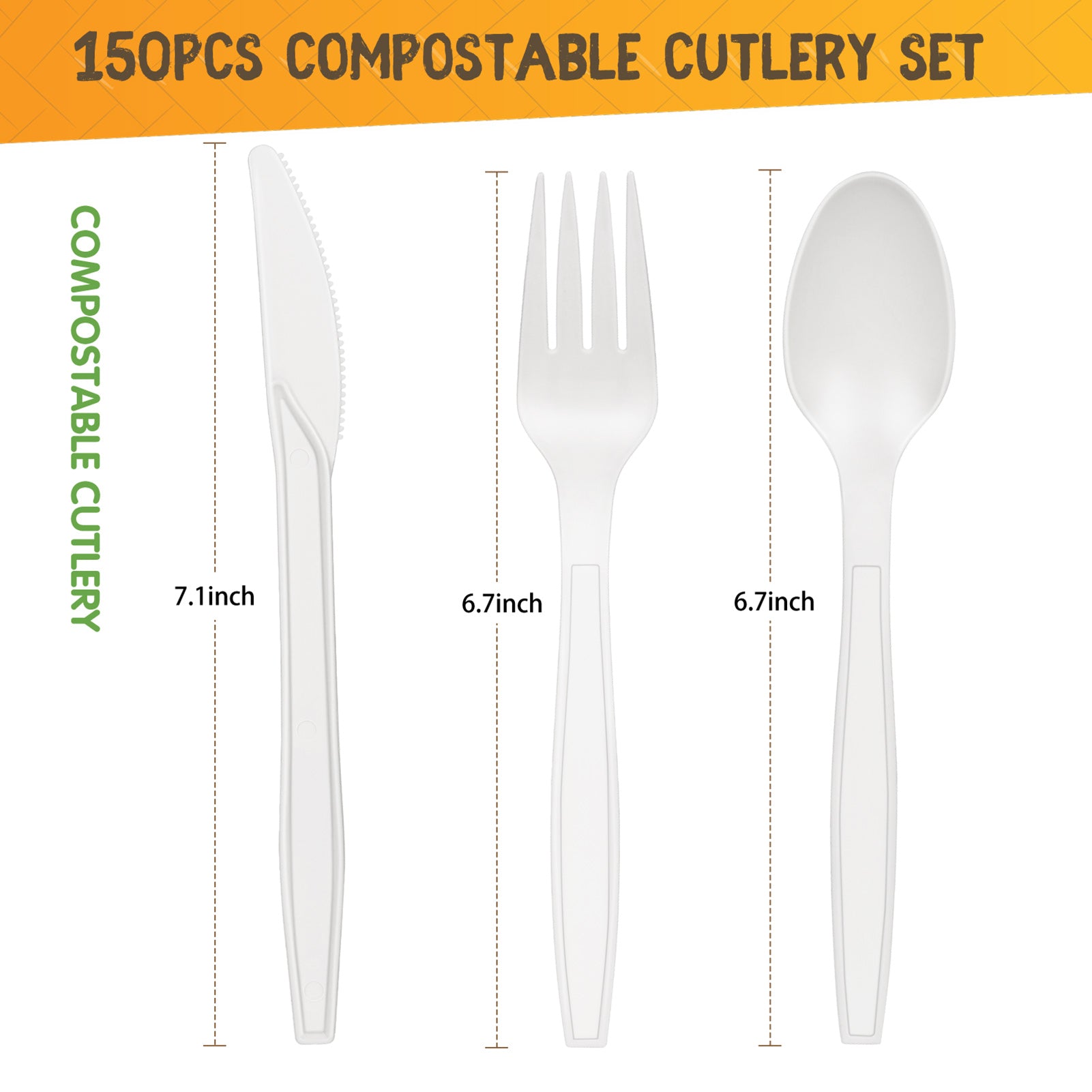 - 150 pieces Cutlery Set: 50 forks 6.7-inch, 50 spoons 6.7-inch, and 50 knives 7.1-inch. Compostable and biodegrable